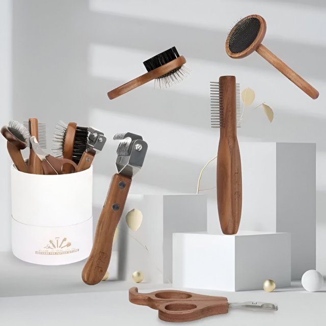 This set includes four different combs and a sturdy nail clipper, giving you all the tools you need for regular grooming at home. Each comb is crafted from smooth wood and durable stainless steel, offering a gentle glide that helps remove loose hair, detangle knots, and massage your pet’s skin. The nail clipper provides a clean, precise trim, helping keep paws healthy and comfortable. With sizes ranging from approximately 1.9 × 5.6 inches to 2.7 × 5.8 inches, these tools are easy to grip and comfortable to use.